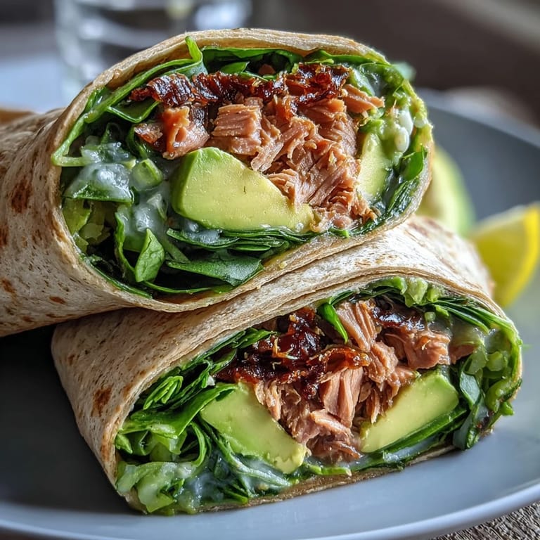 Merken There's something almost meditative about assembling these wraps on a quiet Tuesday afternoon, when the kitchen feels like my own private sanctuary. My colleague Marcus once mentioned offhand that he'd been eating the same sad desk salad for months, and something about his resigned sigh made me think he deserved better. That's when I started experimenting with wraps that felt luxurious but didn't require any cooking—just good ingredients and five minutes of my time. The creamy avocado meeting the briny tuna clicked instantly, like two flavors that had been waiting to find each other. Now these wraps show up in my rotation whenever I want something that tastes indulgent but keeps me sharp and satisfied.