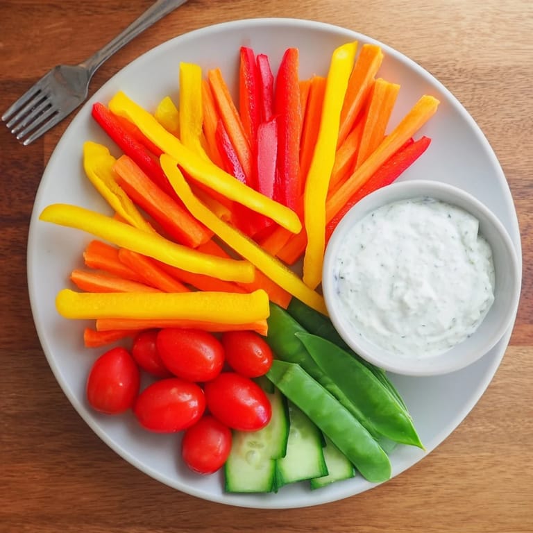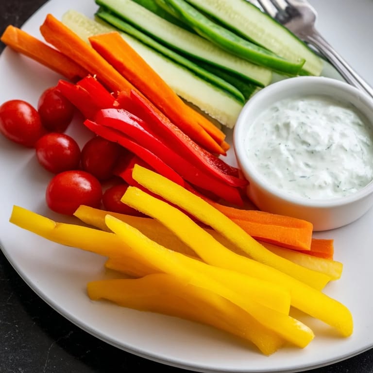 - Paprika in dünne Streifen schneiden und in Sektionen neben Gurken und Karotten für zusätzliche Farbe arrangieren.
