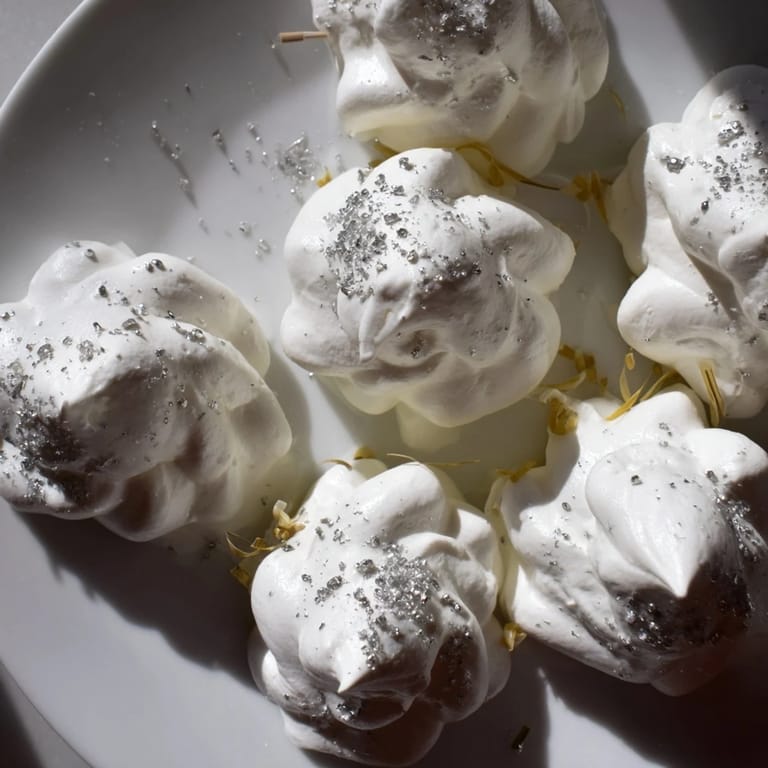 Mini-Meringues und weiße Schokoladentrüffel werden als süße Akzente verteilt, um die Wolkenoptik zu verstärken.