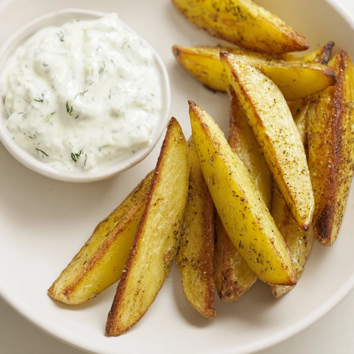 Merken Goldene, knusprige Ofenkartoffeln mit einem cremigen, aromatischen Kräuterquark-Dip – ein einfaches und zufriedenstellendes Klassikerrezept, perfekt für jede Mahlzeit.