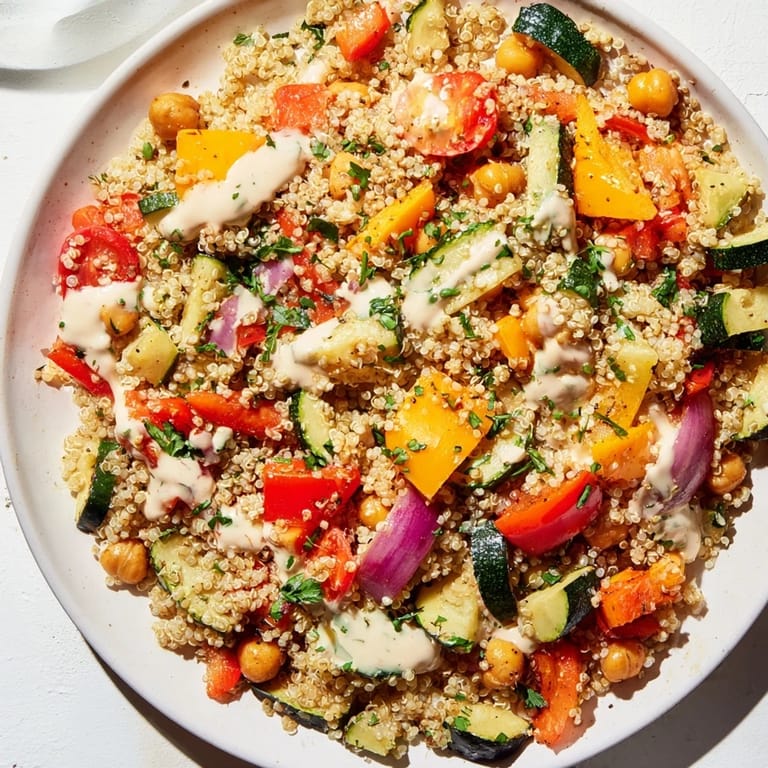 Dieser bunte Power Salat kombiniert locker gekochte Quinoa mit geröstetem Gemüse wie Paprika, Zucchini, Karotten und roten Zwiebeln. Herzhaft abgerundet mit Kichererbsen, Cherrytomaten und frischer Petersilie, sorgt das cremige Tahini-Zitronen-Dressing für eine ausgewogene Frische. Leicht, gesund und nährstoffreich, eignet sich diese Mischung prima als leichtes Mittagessen oder leckere Beilage. Das Rösten verstärkt die Aromen des Gemüses, während die Quinoa für eine sättigende und proteinreiche Basis sorgt.