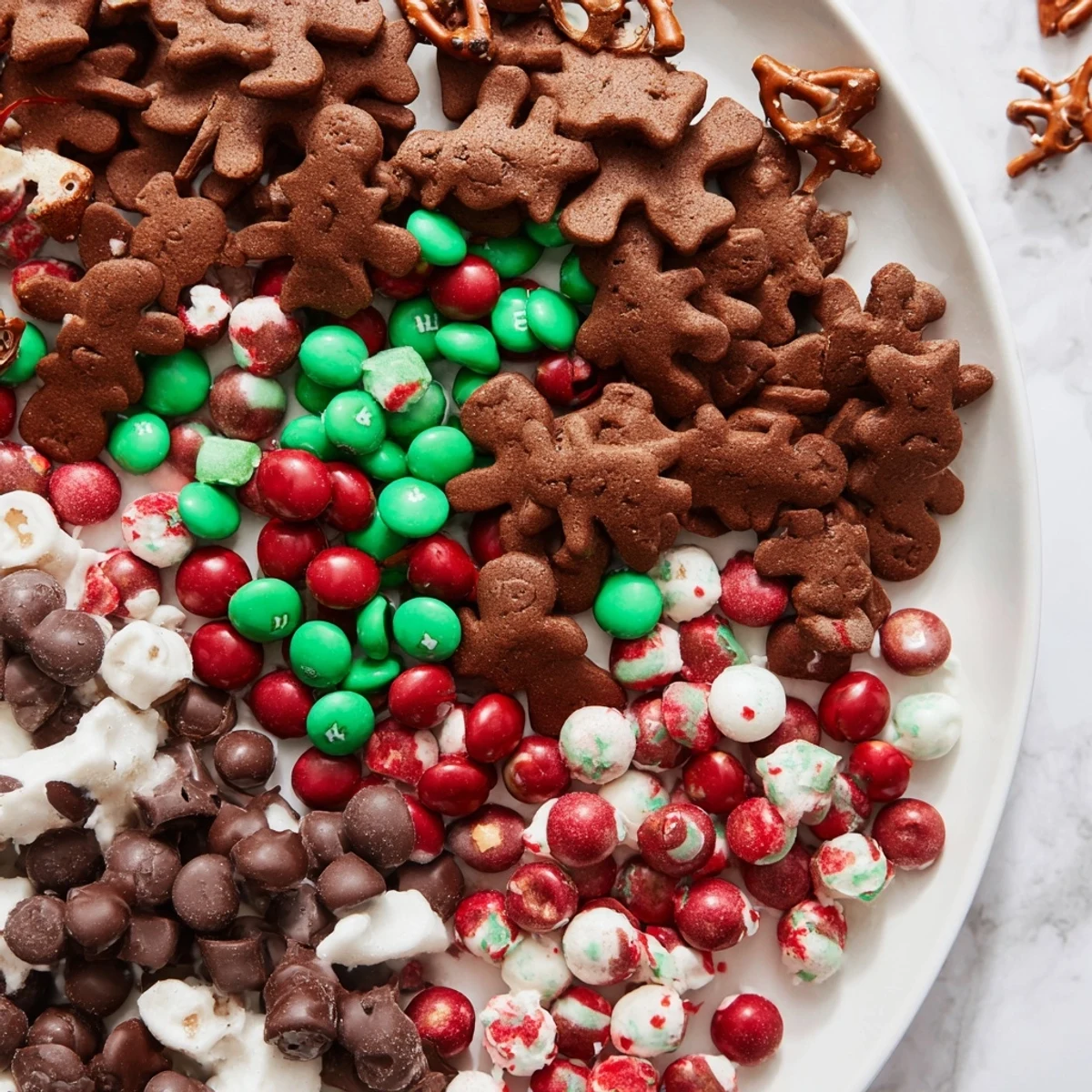 - Schokolade & Bonbons: 1 Tasse rote und grüne M&Ms, 1 Tasse gemischte weihnachtliche Schokoladentrüffel, 1 Tasse Pfefferminzrinde-Stücke, 1 Tasse Zuckerstangen (mini oder zerdrückt), 1 Tasse Gummibärchen oder weihnachtliche Gummis, 1 Tasse schokoladenüberzogene Brezeln, 1 Tasse Marshmallows (mini oder geformt)