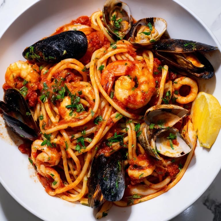 Merken There's a particular magic that happens when you're standing at a fish market on a Friday afternoon, eyeing the glistening seafood display while the vendor calls out the day's catch. That's when I decided to build a pasta dish around whatever looked freshest—shrimp with their translucent shells catching the light, mussels still dripping seawater, squid rings pale and tender. What started as an improvised dinner for friends became the dish I keep coming back to, that one meal where everything on the plate tastes like the Mediterranean and actually feels effortless to pull together.