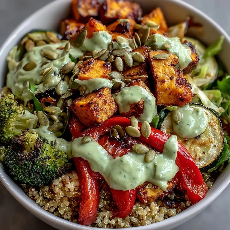 Diese bunte Bowl vereint geröstetes saisonales Gemüse mit herzhaften Körnern wie Quinoa und würzigen Kichererbsen. Das cremige Green Goddess Avocado-Dressing bringt frische Kräuternoten und eine samtige Textur ins Spiel. Die gerösteten Gemüse erhalten durch Paprika und Kreuzkümmel eine würzige Tiefe, während Kürbiskerne und Rotkohl knackige Akzente setzen. Mit einem Spritzer Zitrone wird die Bowl perfekt abgerundet. Schnell zubereitet, einfach zu variieren und ideal als sättigendes, pflanzenbasiertes Gericht.