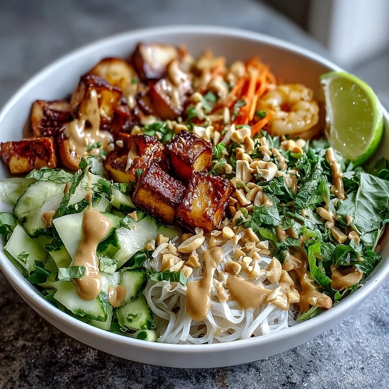 This bowl is a complete, satisfying meal on its own, but it pairs beautifully with a light miso soup or a simple edamame appetizer. Serve it family-style at the center of the table with all the components in separate bowls and the peanut sauce in a small pitcher so everyone can assemble and dress their own—it turns dinner into an interactive, joyful experience. For a refreshing drink pairing, try iced jasmine tea or sparkling water with a slice of lime and a sprig of fresh mint. Leftovers store well in airtight containers in the refrigerator for up to two days; keep the sauce separate and add it just before eating to preserve the freshness of the vegetables and herbs.