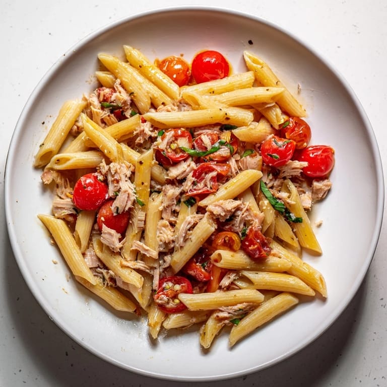 Merken Ein schnelles, geschmackvolles Pastagericht mit saftigen Tomaten und zartem Thunfisch, perfekt für eine schnelle und zufriedenstellende Mahlzeit.