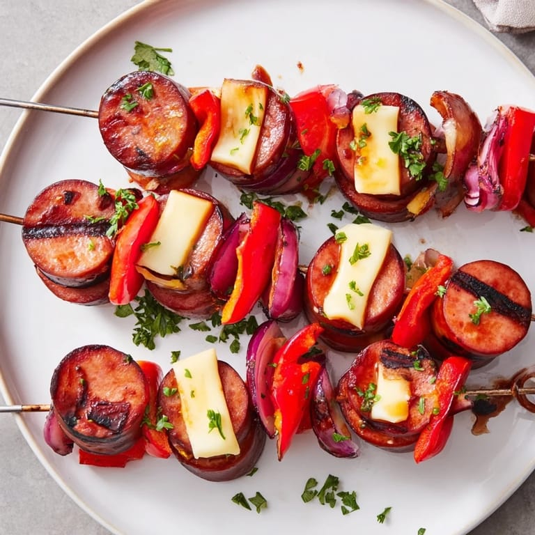 Merken Würzige Spieße: Schornstein-Stapel mit Wurst und Käse sind ein herzhaftes und geschmackvolles Appetizer, das geräucherte Wurstscheiben und geschmolzene Käsewürfel auf Spießen stapelt und grillt, perfekt zum Teilen bei Zusammenkünften.