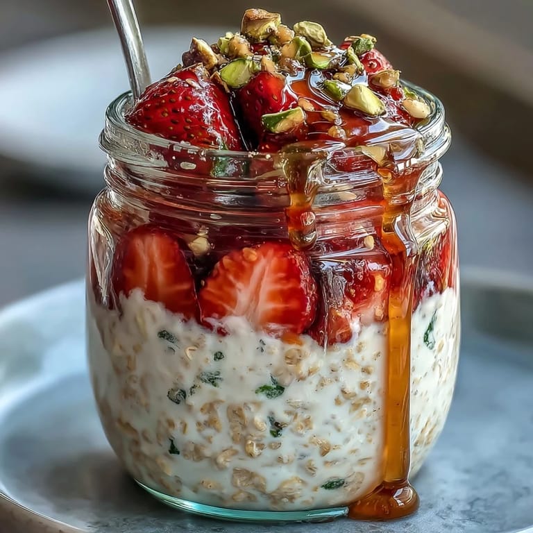 Merken Imagine waking up to a breakfast that's already prepared, waiting for you in the fridge like a little morning miracle. These Strawberry and Pistachio Overnight Oats with Honey are the answer to busy mornings and wholesome starts. Creamy rolled oats mingle overnight with Greek yogurt and chia seeds, creating a satisfying texture that's both indulgent and nourishing. Fresh strawberries bring brightness, pistachios add delightful crunch, and a drizzle of golden honey ties everything together in perfect harmony.