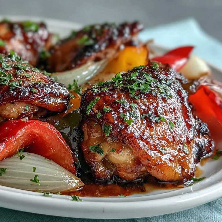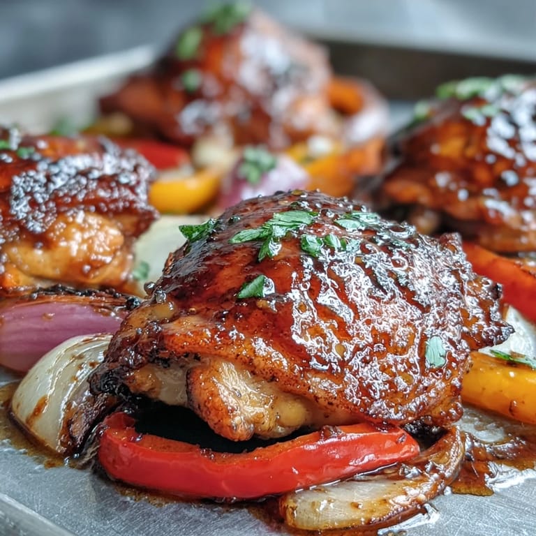 Merken My kitchen fills with the most incredible aroma when I'm making this sheet pan honey garlic chicken, and it happens almost by accident every time. One weeknight, I was juggling three things at once, threw everything onto a single pan, and somehow created the kind of meal that makes everyone ask for seconds before they've even finished their first bite. The beauty of it is that the chicken thighs stay impossibly tender while the peppers char just enough to taste like they've been kissed by fire, all while the naan toasts quietly on the side. It's become my go-to when I want to feel like I've spent hours in the kitchen without actually doing that.