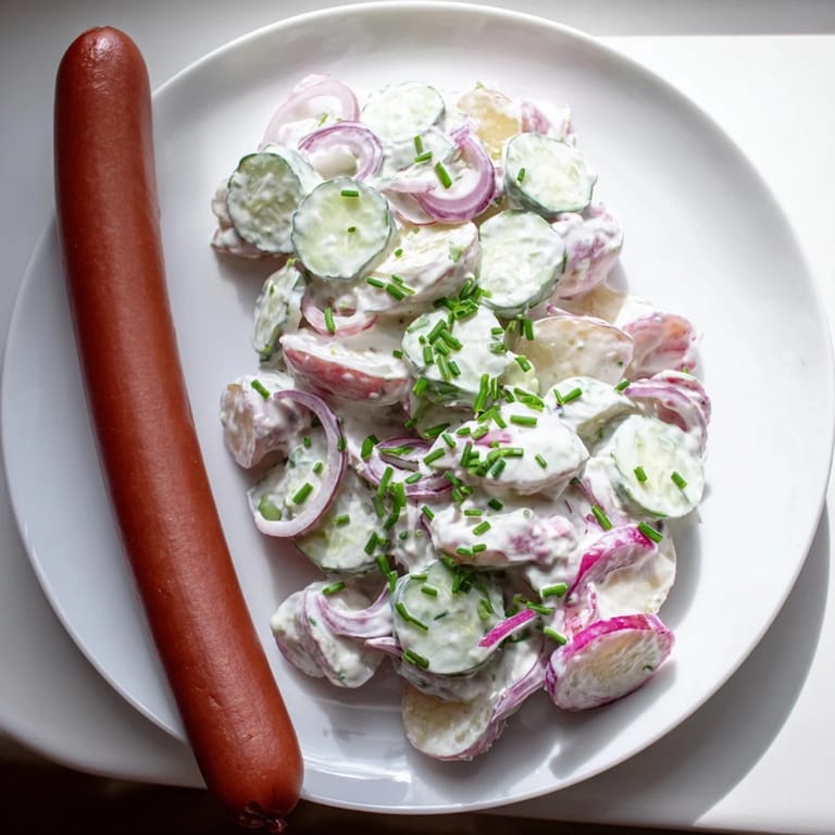 Deutsche Würste wie Frankfurter oder Wiener sind besonders geeignet, da sie mild und saftig sind und gut mit dem Kartoffelsalat harmonieren.