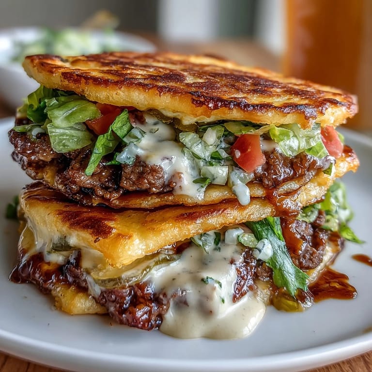 Merken My neighbor showed up one Friday evening with a bag of mini flour tortillas and this wild idea: what if we smashed burger patties right onto taco shells? I was skeptical at first, but twenty minutes later, I was folding one of these crispy, cheesy handheld wonders and wondering why I'd never thought of it before. The beef gets impossibly thin and crispy, the cheese melts into every crevice, and suddenly you're holding something that tastes like a burger and a taco had the perfect dinner date. Now whenever I need to feed a crowd fast, this is my secret weapon.