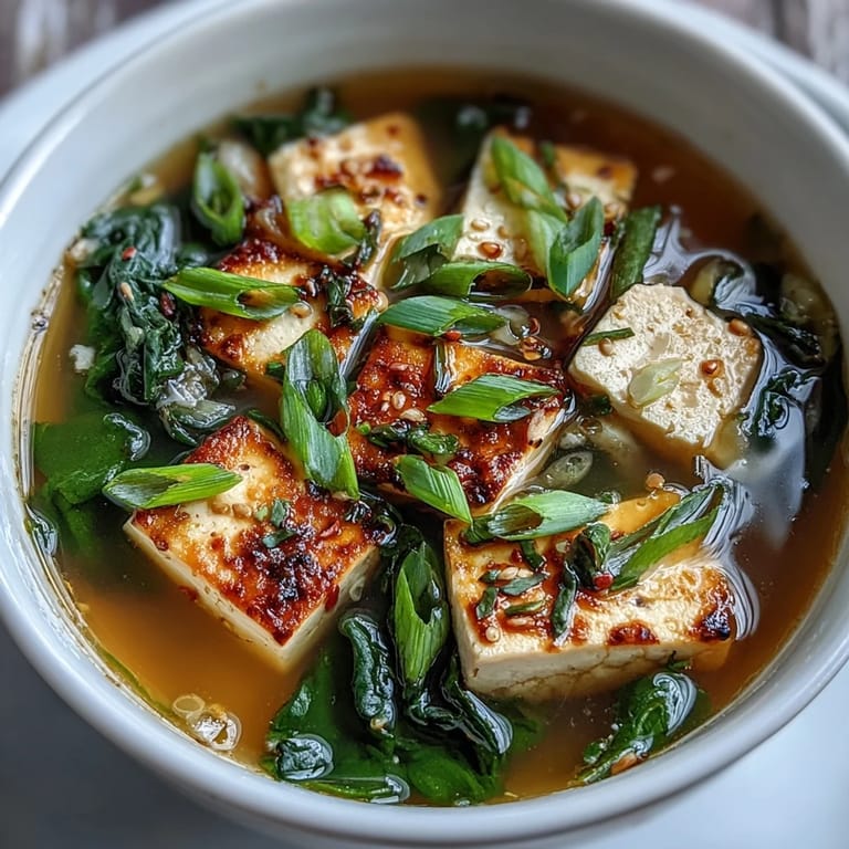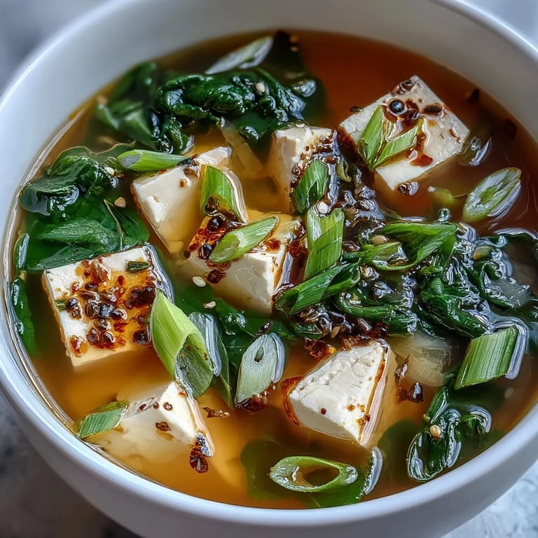Merken There's something almost meditative about watching miso soup come together on a quiet morning. I discovered this version during a particularly hectic week when I needed something that felt both nourishing and uncomplicated, a bowl of warmth that wouldn't demand much from me beyond attention. The silky tofu, the gentle bitterness of spinach, and that umami-rich broth became my anchor, something I'd return to whenever the kitchen felt like the only calm place in my day.