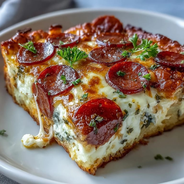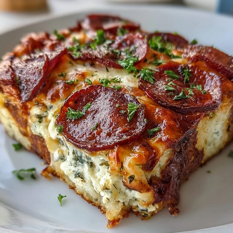 Der Schlüssel zu diesem Gericht ist das Gleichgewicht: Ein dünner, zarter Teigboden liefert Struktur, eine cremige Eier-Schicht verbindet alles zusammen, und die Käse- und Pepperoni-Oberseite bringt Pizza-Geschmack ohne die Schwere eines echten Pizza-Teigs. Dies ist auch, warum Sie es nicht zu lange backen möchten – Sie möchten, dass die Eier leicht gestanden haben, nicht wie hartgekochte Eier in einem Auflauf sitzen.