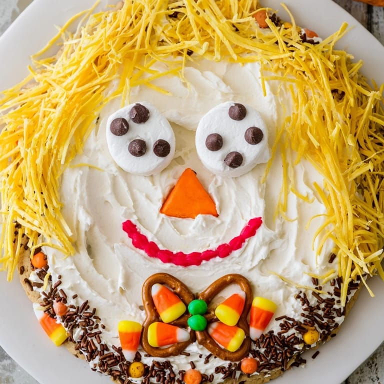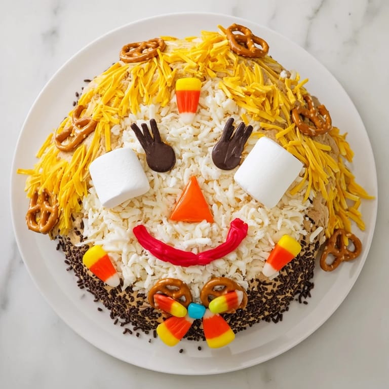 Merken Ein verspieltes und festliches Süßigkeiten-Tablett, das einem fröhlichen Vogelscheuchen-Gesicht ähnelt – perfekt für Herbsttreffen, Halloween-Partys oder als essbares Mittelpunktstück.