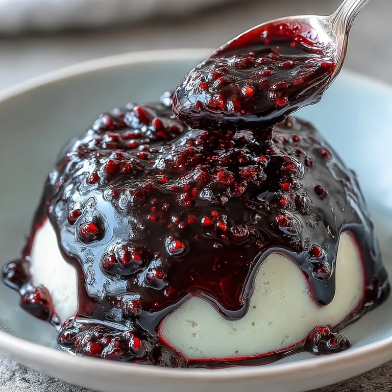 Merken Nachdem ich diese Sauce mehrfach gemacht habe, habe ich festgestellt, dass sie besonders gut zu hellem Dessert passt. Der Kontrast zwischen der tiefdunklen, fast violetten Farbe und cremig weißen Speisen ist einfach wunderschön auf dem Teller.