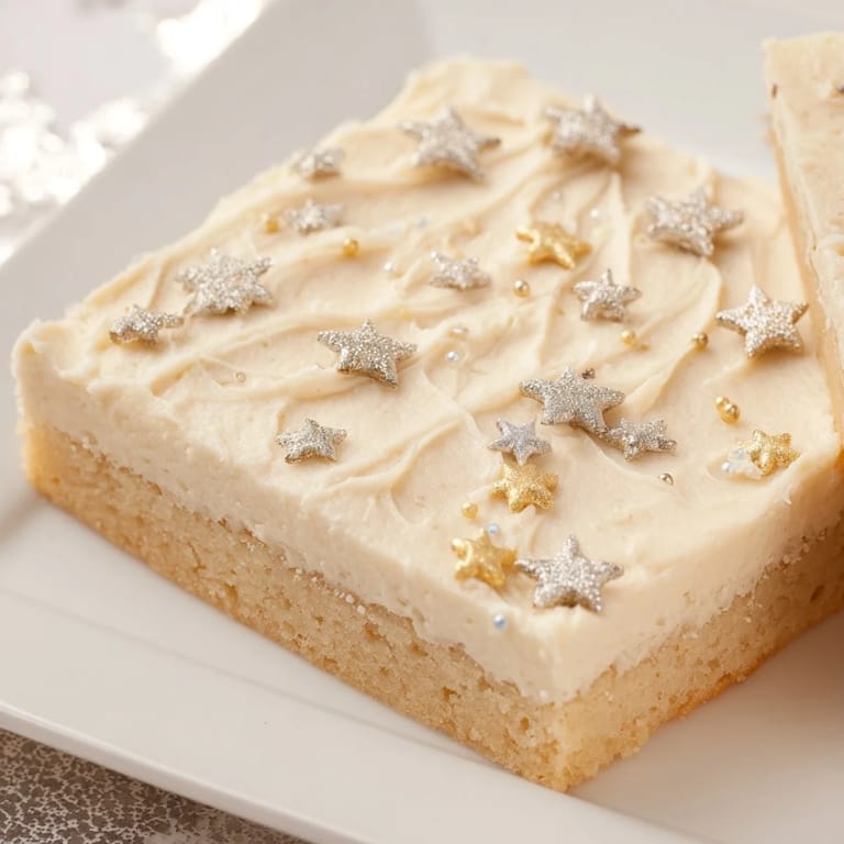 Merken Ein verspielter, buttriger Mürbeteigriegel mit cremigem Vanille-Frosting und funkelnden sternförmigen Streuseln – perfekt für Partys und Feierlichkeiten.