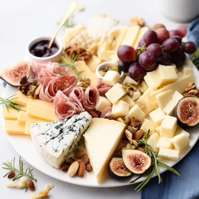 - Käsesorten: 150 g Brie, in Scheiben geschnitten, 150 g gereifter Cheddar, gewürfelt, 150 g Blauschimmelkäse, zerbröselt oder geschnitten, 100 g Ziegenkäse, Rolle oder Medaillons